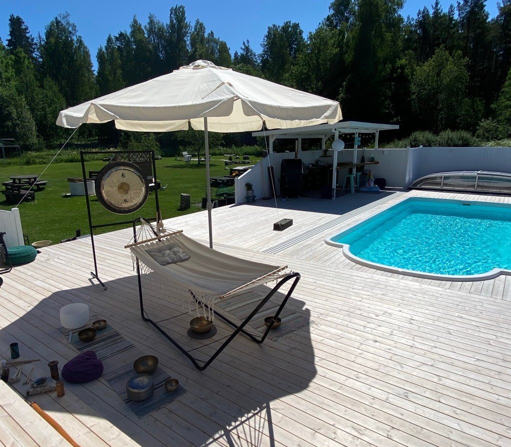 Under sommaren så erbjuder jag en deluxe variant på klangmassage/klangsession/soundjourney där du får vila i hängmattan utomhus och ljuden vibrationerna är runt dig och samverkar tillsammans med alla elementen luft, eld, vatten , jord.